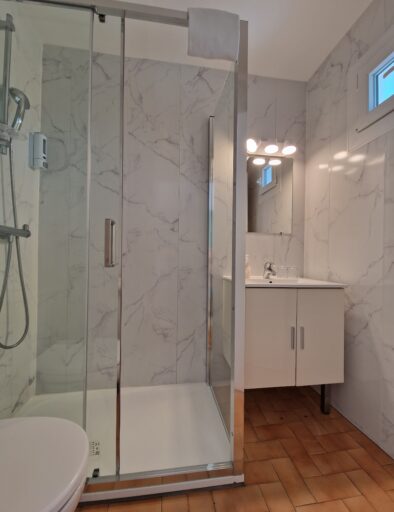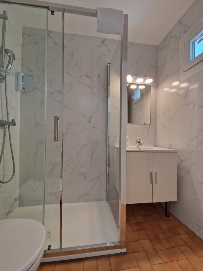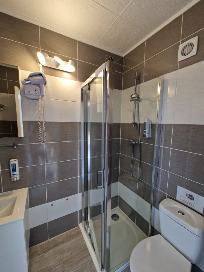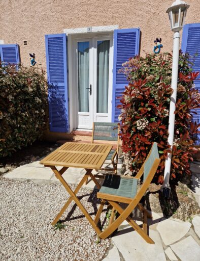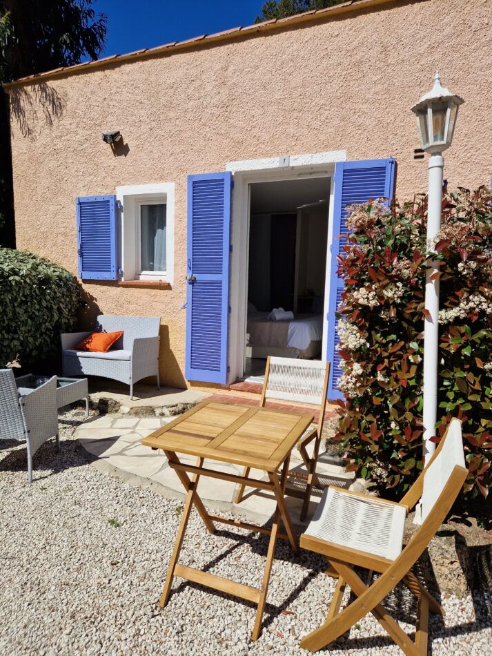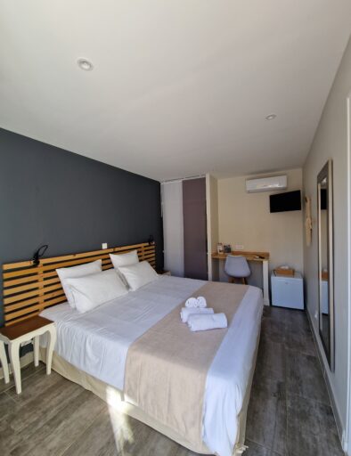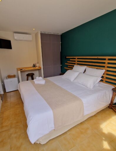 Chambre de 12 m² avec terrasse 1 lit king size 2x90 Chambre équipée de : clim - dressing - coffre - bureau - tv - wifi salle de bain douche - sèche cheveux - petit frigo